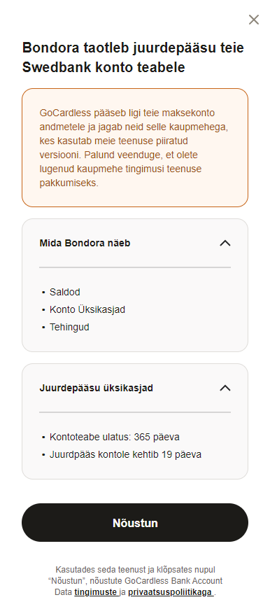 Parima võimaliku laenupakkumise saamiseks palume Sul üles laadida oma kõige värskema(d) pangakonto väljavõtte(d) GoCardless'i vahendusel. Väljavõtte põhjal saame kiiresti kontrollida Sinu finantsseisu ja -ajalugu ning hinnata maksekäitumist. Ole mureta – kogu protsess on privaatne ja turvaline. Lisainfot GoCardless'i kasutustingimuste kohta leiate SIIT.